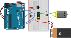 Breadboard diagram of an Arduino Uno connected to a motor driver to control a DC motor.
