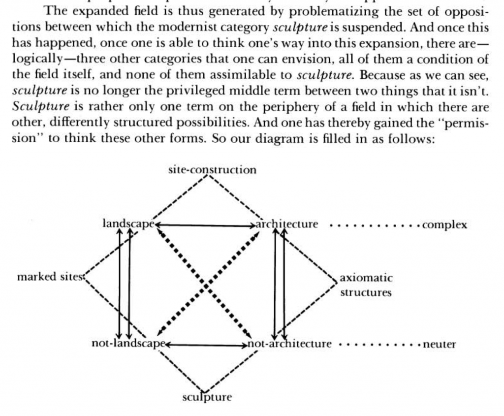 In her 1979 essay “Sculpture in the Expanded Field,” the American art critic Rosalind Krauss utilized a method for thinking about categories that have exhausted themselves. Her “expanded field” diagram transposes its logic from the semiotic square, a structuralist analysis tool also known as a Greimas square after Lithuanian-French semiotician A. J. Greimas, in which a term, its pure contradiction, and their negations generate a four-part conceptual field. Krauss begins with sculpture defined negatively—neither landscape nor architecture—and then restores those excluded poles to visibility. Once the oppositions are mapped, the field of possible forms becomes legible: site constructions, marked sites, axiomatic structures, and the unstable central category that had previously gone by the name sculpture.