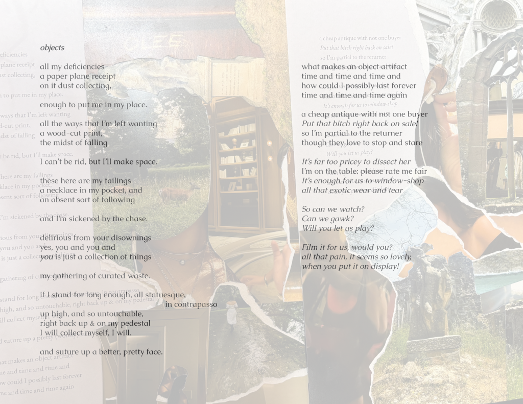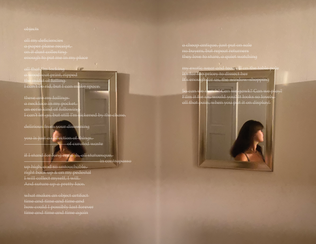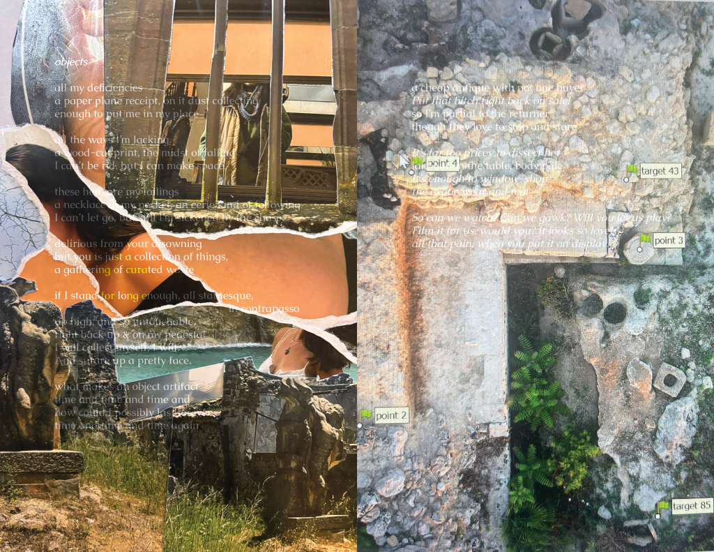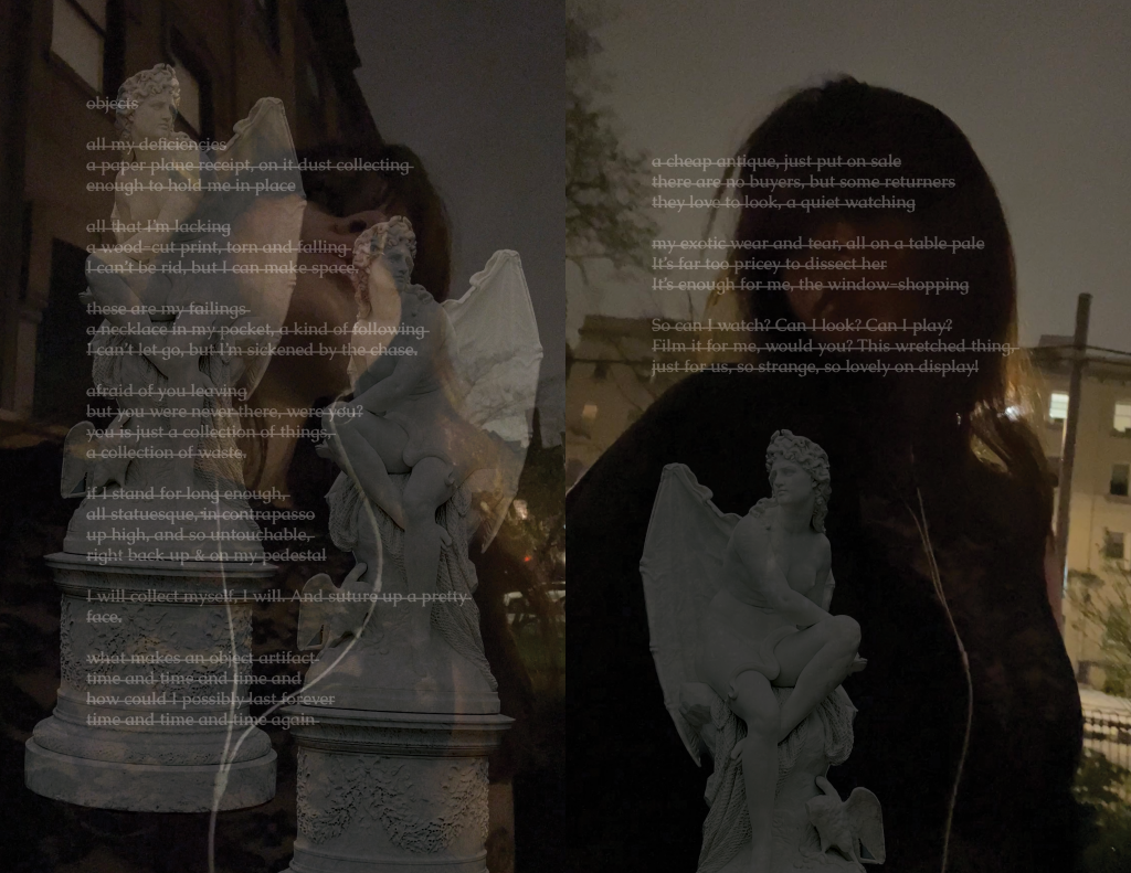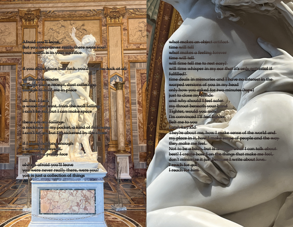 I write poetry to process emotions and often start a poem by writing a bunch of phrases to describe a current feeling or memory I’m sitting with. From there, of course, I rewrite, cut, and write more… but a lot of my time editing is spent arranging, much like I arrange the ornaments in my room. I saved 11 versions of Objects throughout my time working on it. Even when I had the final poem, the one I was truly happy with, I still thought about the previous 10. Together they show a process, but apart they are just a memory or an underdeveloped feeling. I wanted them to be included in the composition for Objects, but also to be situated as unlike the 11th poem. So, I created 10 collages to introduce it, using the 10 poems and photographs from my camera roll. I chose pictures that were related to the imagery or specific phrases in the poem, like pictures of myself, my bedroom wall, physical collages, and relevant art / artifacts I had captured while traveling, such as Bernini’s statue, The Abduction of Proserpina. I wanted to layer my memories while also placing myself as a character in conversation with the objects I felt so similar to.