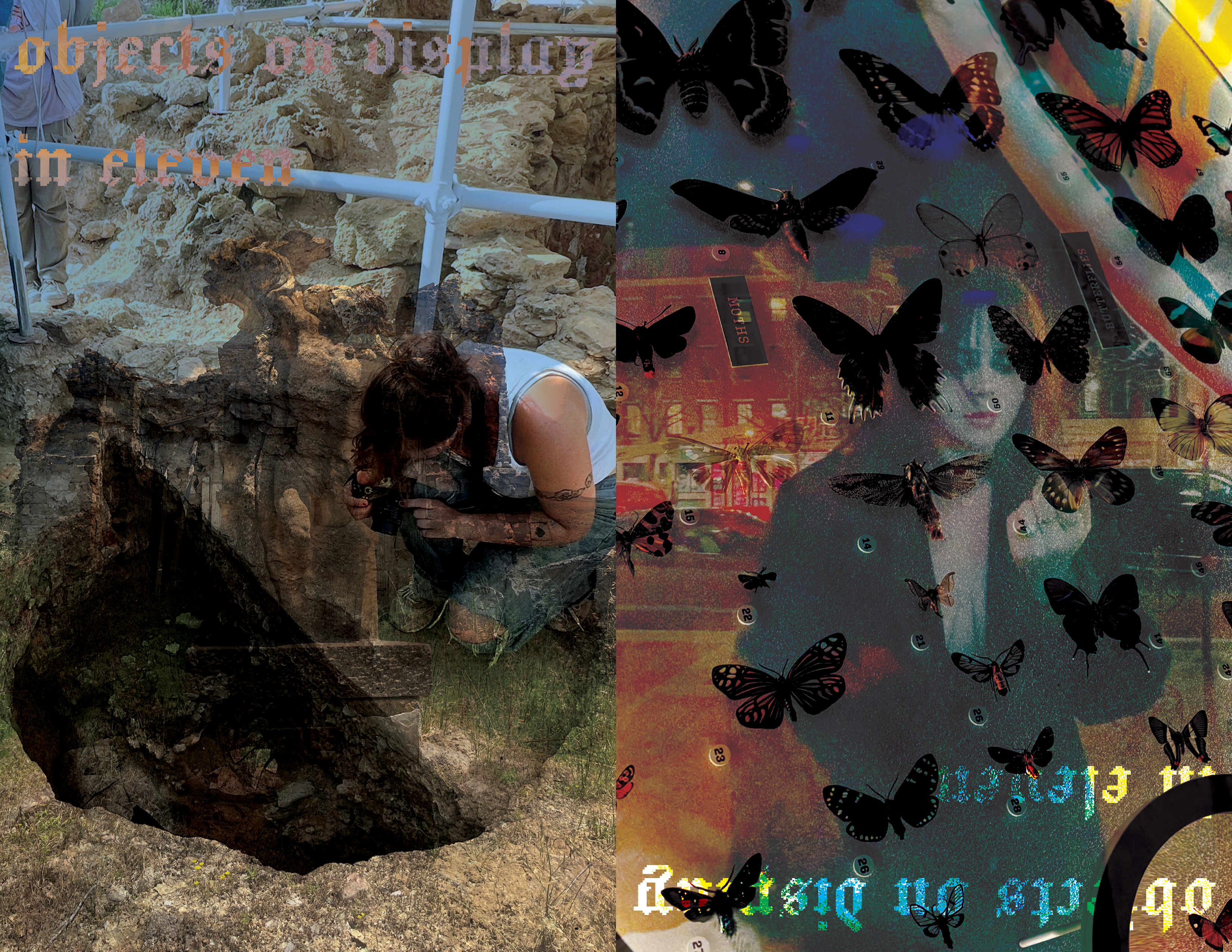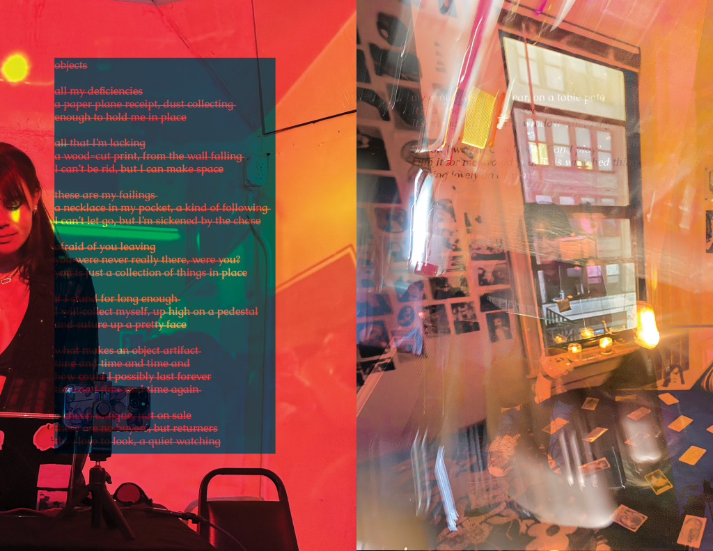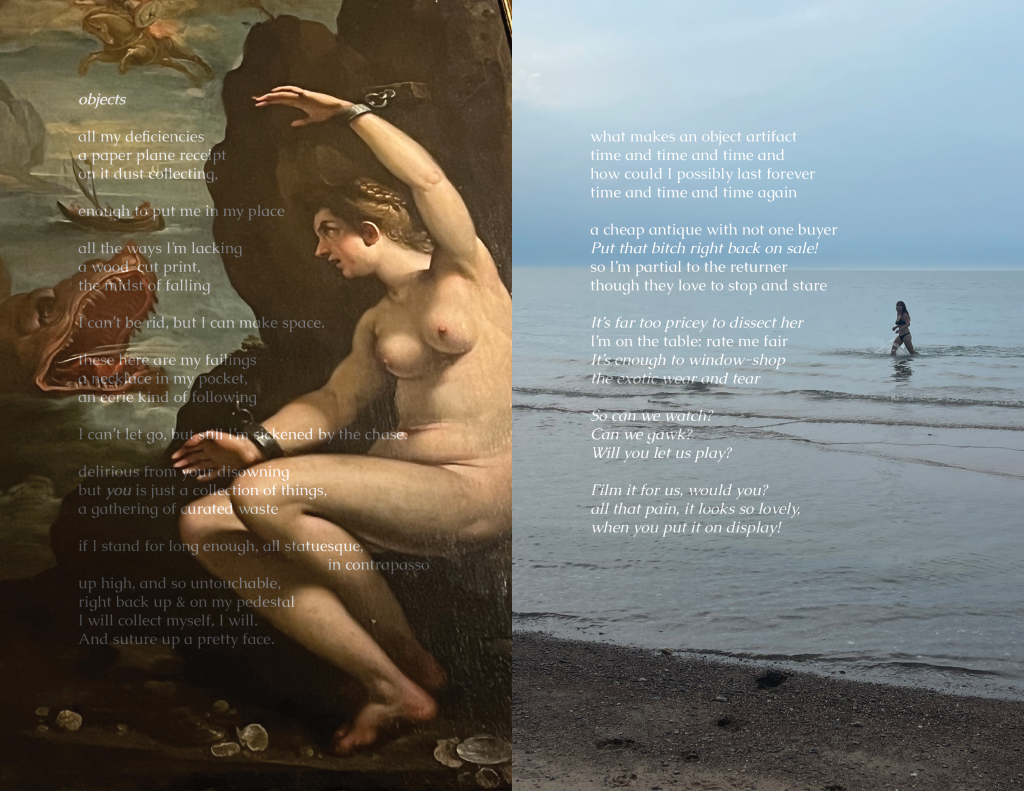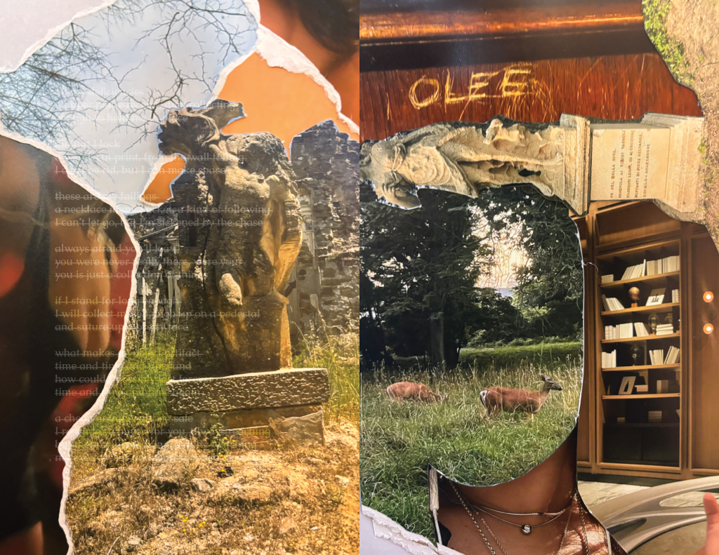 I write poetry to process emotions and often start a poem by writing a bunch of phrases to describe a current feeling or memory I’m sitting with. From there, of course, I rewrite, cut, and write more… but a lot of my time editing is spent arranging, much like I arrange the ornaments in my room. I saved 11 versions of Objects throughout my time working on it. Even when I had the final poem, the one I was truly happy with, I still thought about the previous 10. Together they show a process, but apart they are just a memory or an underdeveloped feeling. I wanted them to be included in the composition for Objects, but also to be situated as unlike the 11th poem. So, I created 10 collages to introduce it, using the 10 poems and photographs from my camera roll. I chose pictures that were related to the imagery or specific phrases in the poem, like pictures of myself, my bedroom wall, physical collages, and relevant art / artifacts I had captured while traveling, such as Bernini’s statue, The Abduction of Proserpina. I wanted to layer my memories while also placing myself as a character in conversation with the objects I felt so similar to.