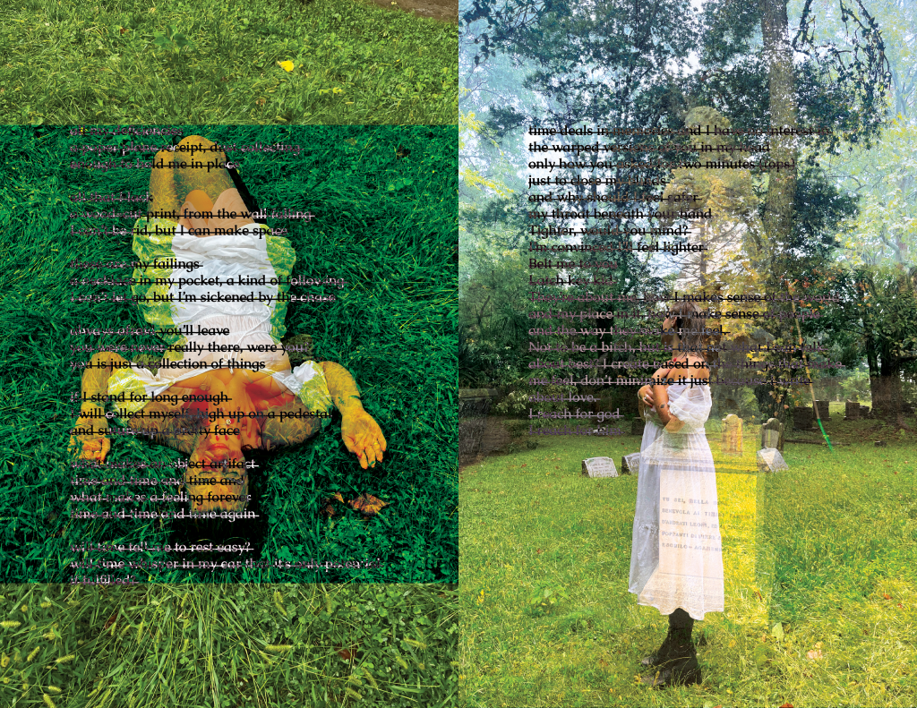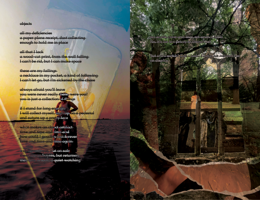 I would call myself a collector. I have a hard time letting go of trinkets, memories, and people. My bedroom walls are covered in photos, collages, notes, and drawings; every surface has a dish for jewelry or lighters or rocks, and in the corner of my room, I have a classical-style bust of a woman’s torso. The first thing I do when I move into a new place is decorate my room with the physical manifestation of my memories. But sometimes memories sour and their ornaments simply become reminders. I wrote this poem in a moment when I felt very similar to those objects left behind, and left on display.