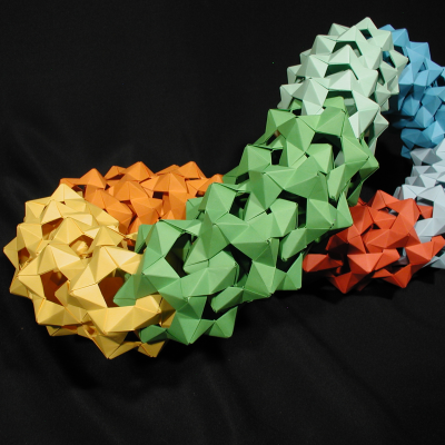 We'll be briefly looking at some examples of modular origami online, both structured and unstructured, to motivate the folding session. Then we will fold modules and put them together to have a big polyhedron paper sculpture that we made together!