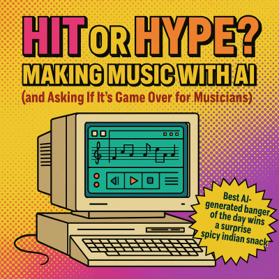 Join for a fun, hands-on session where we create original songs in real-time using SUNO AI — no instruments, no experience required. We’ll prompt the machine, listen to wild results, and jam together as a group. The best AI-generated banger of the day will win a surprise spicy Indian snack 🔥🌶️ — because what’s music without a little heat?