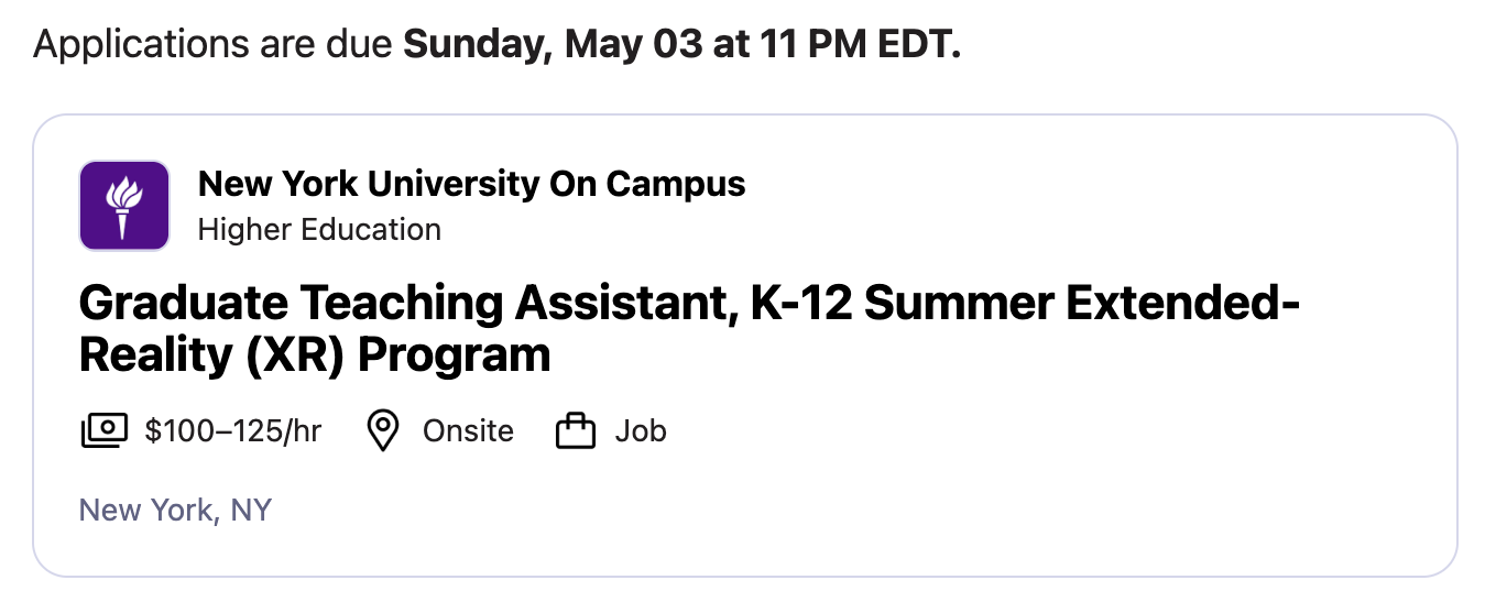 JOB: Graduate Teaching Assistant, K-12 Summer Extended-Reality (XR) Program