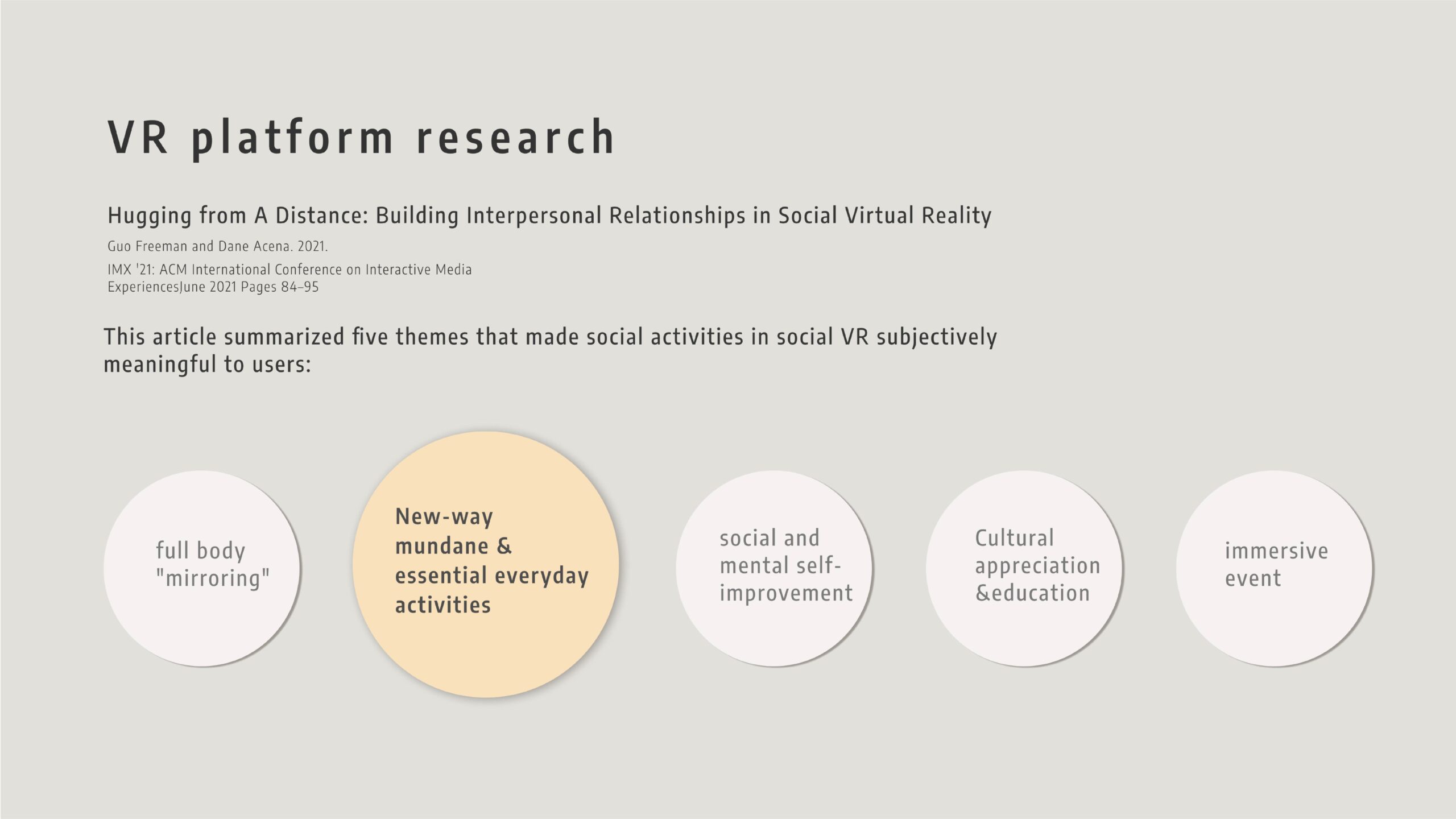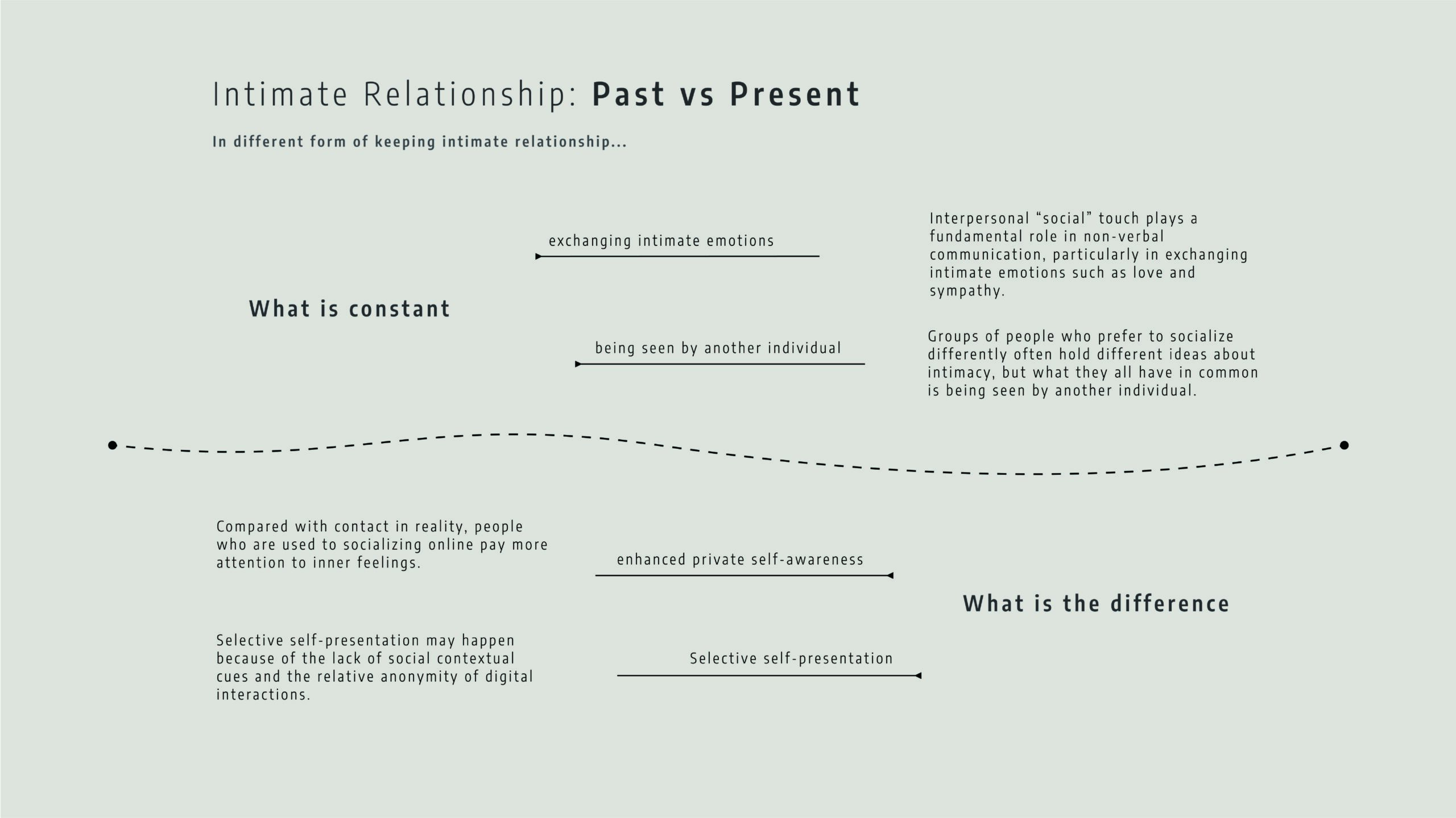 First part of my research is analysis of the intimacy among people from past to present. In second part I chose VR as an example platform to explore more about how the new technology changes the way of communication Back to my intention: warm connection among human should not be ignored. I decided to use a traditional love language in the advanced platform, ideally in VR, to explore the new form of love language. Also to remind people of that bonding is the most important thing no matter how technology changed our lives.