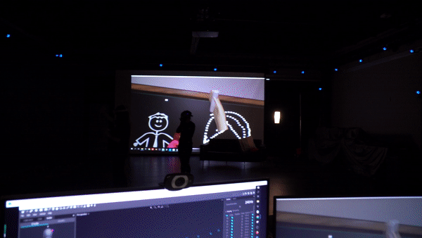 I used real-time motion capture technology, specifically the OptiTrack system, to capture live data from the actor's movements in Motive, which was then imported into MotionBuilder and finally into Unreal Engine. Unreal Engine, Maya and Blender were used for world building and character design. The floor lamps on the stage used MR16 bulbs, which were connected to an Arduino that transmitted data to Max/MSP, which then fed into Unreal Engine, allowing the VR and on-stage lighting to be synchronized in real-time. For the dancing portion, I experimented with attaching a rigid body to the VR headset so that the OptiTrack camera could detect its position.